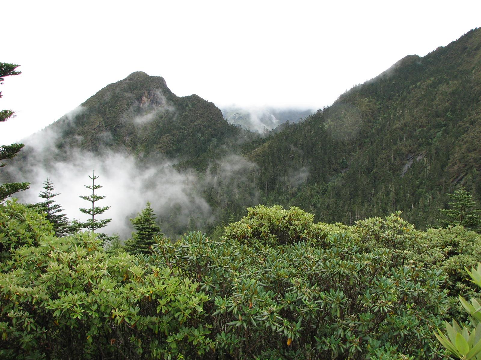 Yunnan:Xianggelila (香格里拉) Xian (formerly Zhongdian Xian). Haba Xue Shan (Haba Snow Mountain). N facing slope near Yügutu. Abies- Picea-Larix forest with several species of mixed evergreen Rhododendron, including R. arboreum (mostly stump sprouts - original trees cut for firewood) and R. wardii. 27°22'40"N, 100°4'36"E; 3780-3930 m.