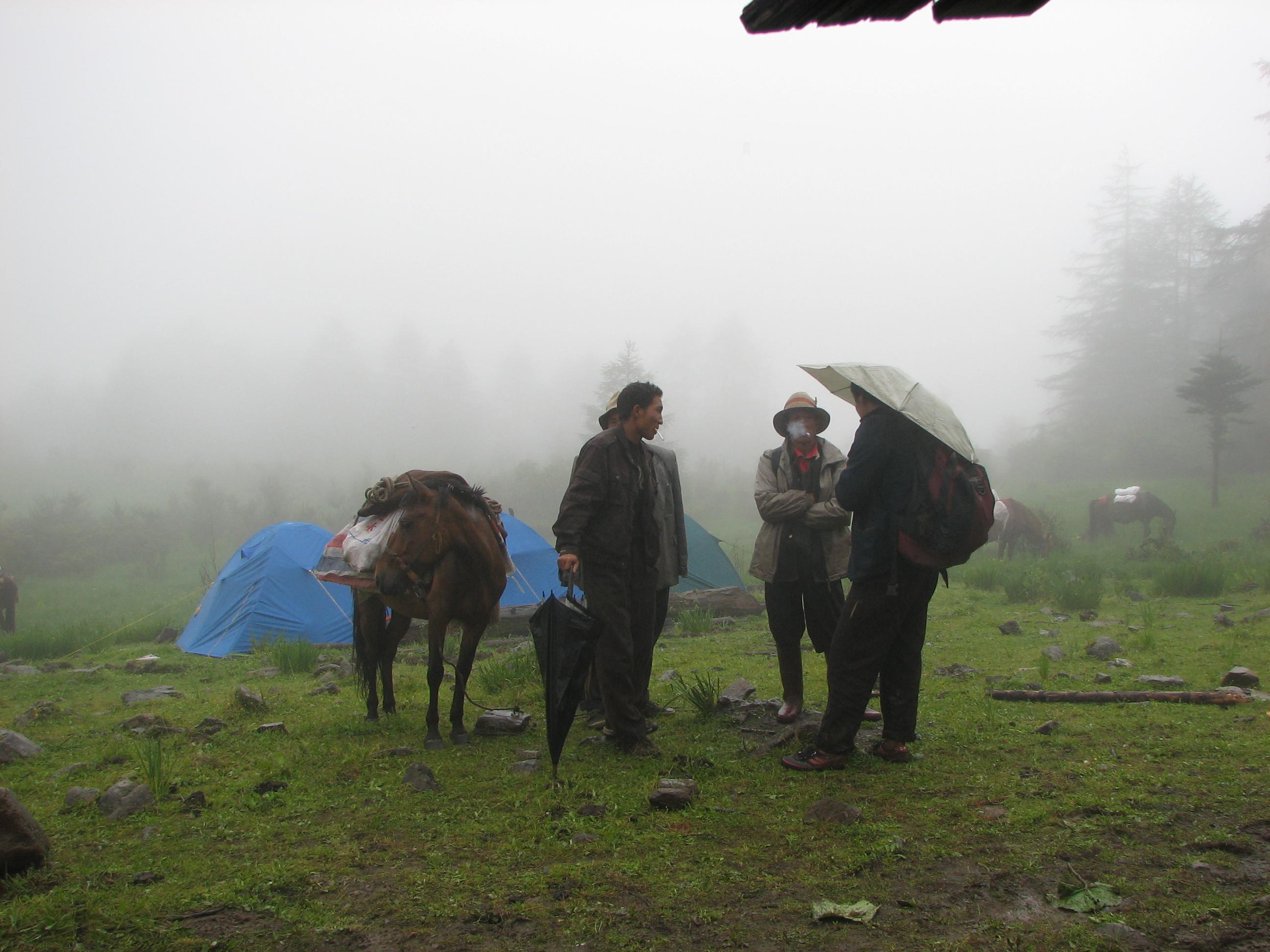 Sichuan, Zhongdian Xian, Haba Xueshan. Preparing to break camp. Porters with horses