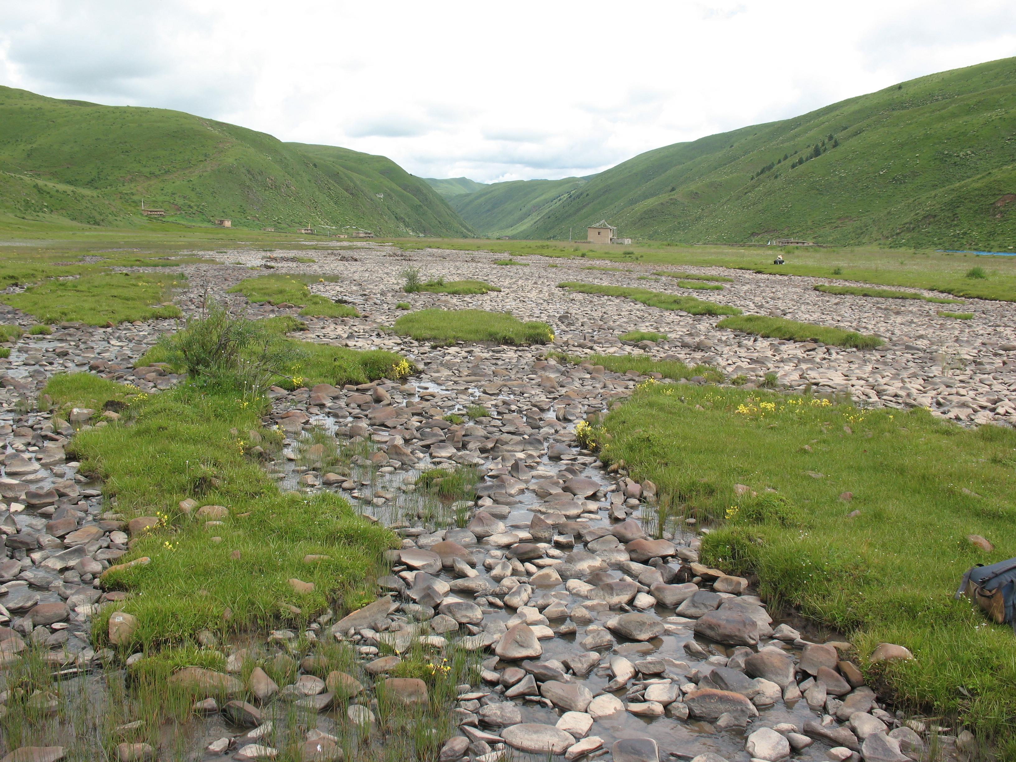 Sichuan:Rangtang (Zamtang) Xian. N of the city of Rangtang (Zamtang) on road to Aba Xian, then E on road to Zhong Rangtang along Maierdi-anma (river), then S along stream ca. half way to Chotuo. Broad, flat valley with a network of meandering rocky streams and marshy places, adjacent meadow, slopes with shrubs and outcropping ledges. 32°15'23"N, 101°11'39"E; 3570-3730 m.