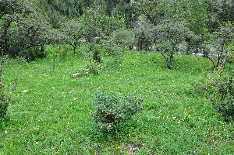 Meadow beside stream and slope, both with scattered shrubs; Berberis and Salix dominant, with Rosa and scattered Picea and Juniperus.