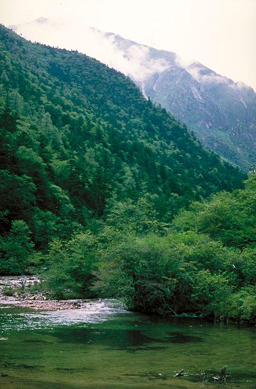 Abies, Larix, Betula forest with Rhododendron understory in many places.