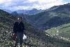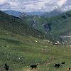 Kobresia meadows, dwarf Rhododendron-Salix scrub and stony scree slopes above pass.