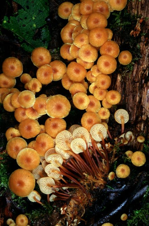 Dark orange-brown, pale gills, see photo.