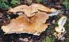 Pileus 5-25 cm, flabelliform, red-orange, orange or yellow, dry, margin waved. Hymenophore decurrent; pores white, 2-3/mm. Stipe short. Context yellow to orange.