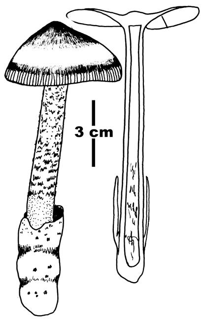 Pileus 5-6 cm in diam., first dull (dark) brown, then brown to brownish, disc brownish gray to darker; at inner end of striations on pileal margin with a dark brown or blackish zone. Lamellae free, white to grayish; edge grayish to brownish. Stipe 9-11 x 1-1.5 cm, dirty white to brownish or grayish, densely covered with brown to grayish brown squamules. Context white, unchanging. Volva 4-5 x 2-2.5 cm, thin, outer surface gray with brownish tinge; inner surface dirty white to grayish or brownish. With line drawings.