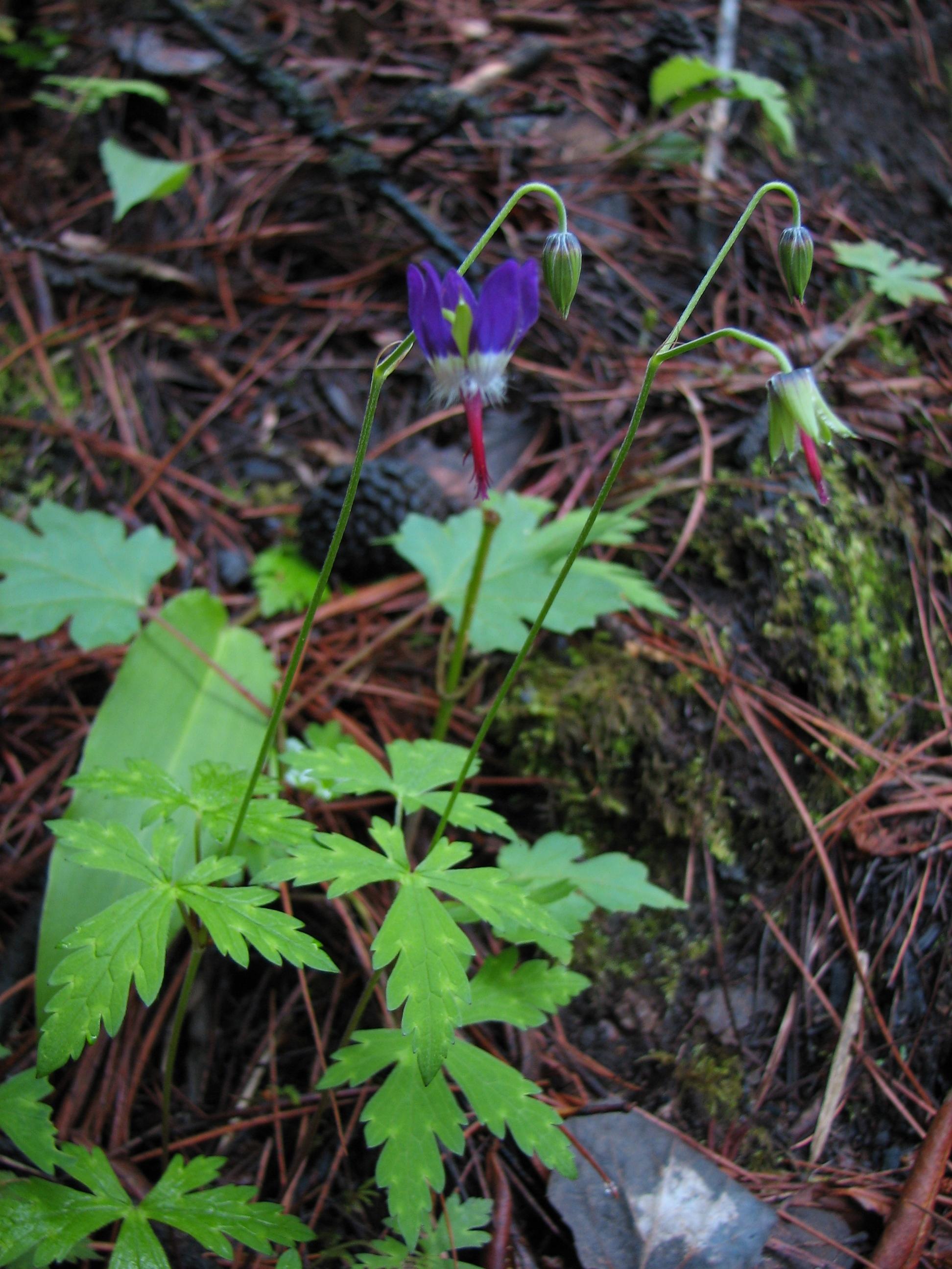 Moist forest floor.Scattered; petals deep purple, base whitish green; filaments reddish; anthers blackish.