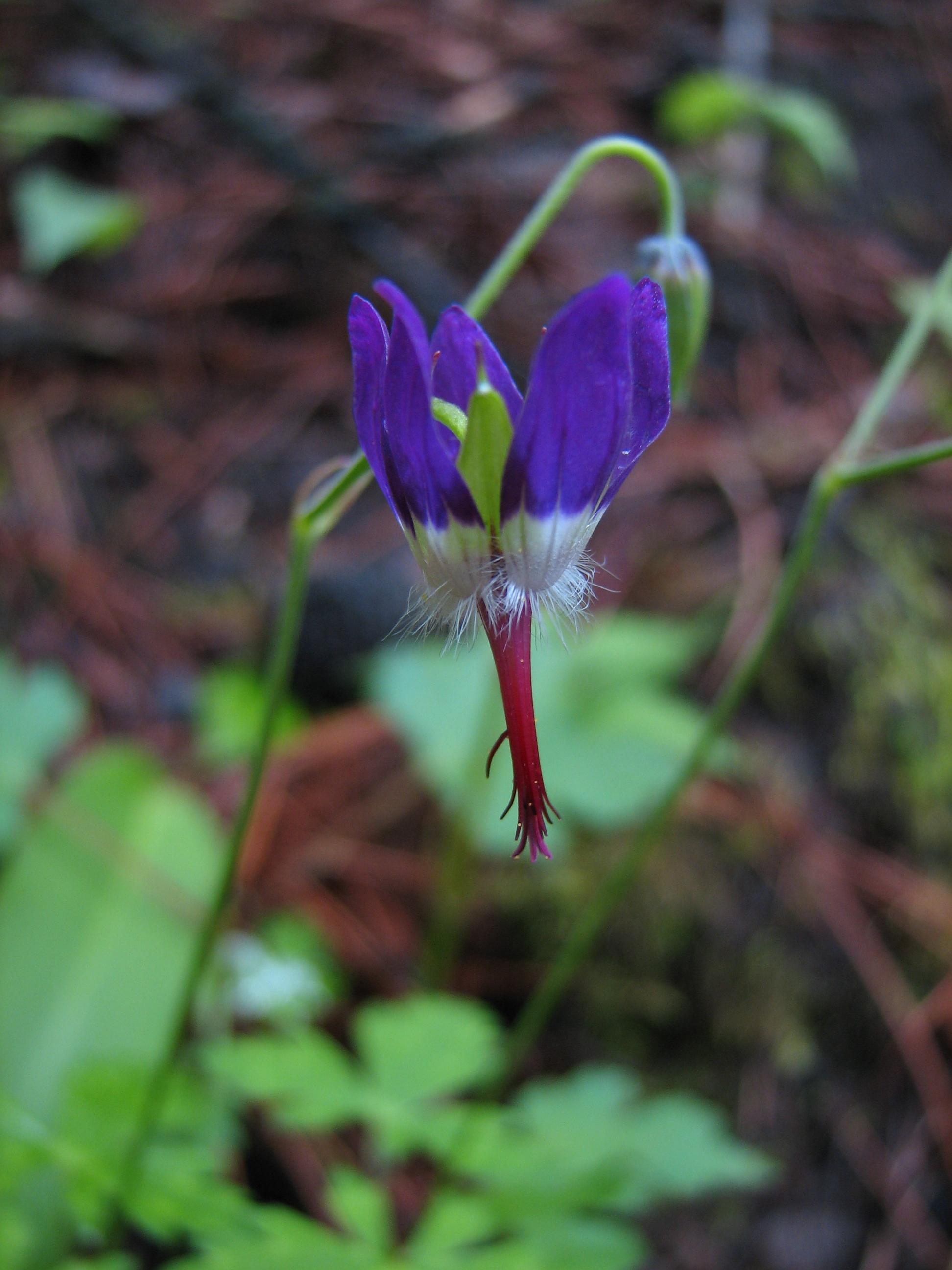 Moist forest floor.Scattered; petals deep purple, base whitish green; filaments reddish; anthers blackish.