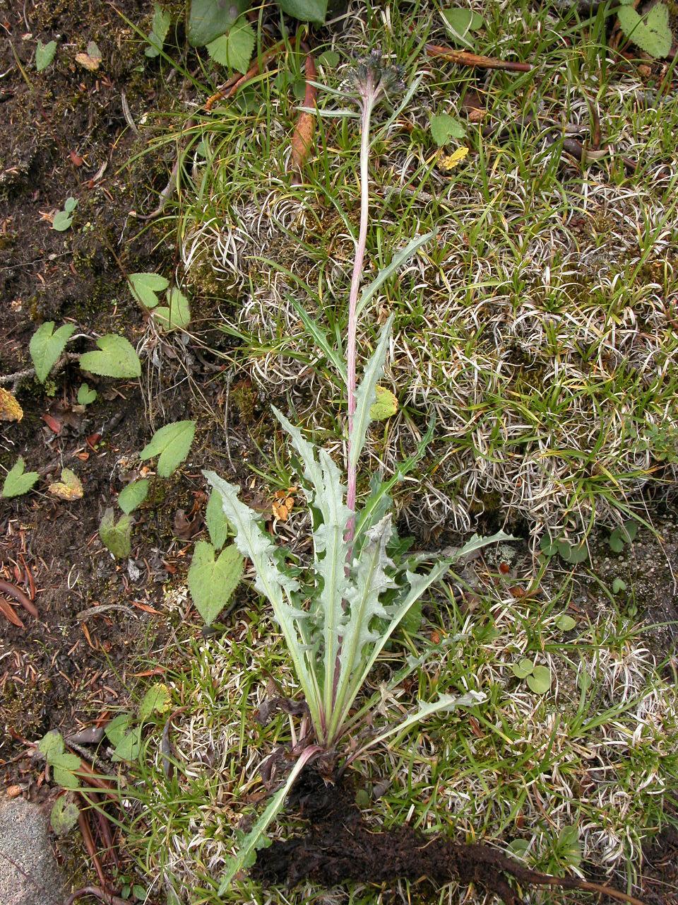 In open between rocks and under Rhododendron. Leaves abaxially white, adaxially green; involucral bracts green; florets pale purple; anthers dark bluish purple; stigmas pale purple.