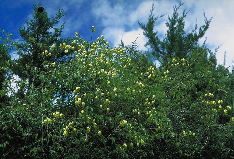 Growing over Berberis, Rosa and Ribes; flowers yellow green.