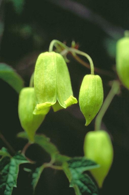 Growing over Berberis, Rosa and Ribes; flowers yellow green.