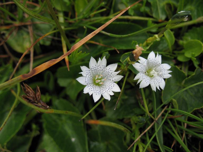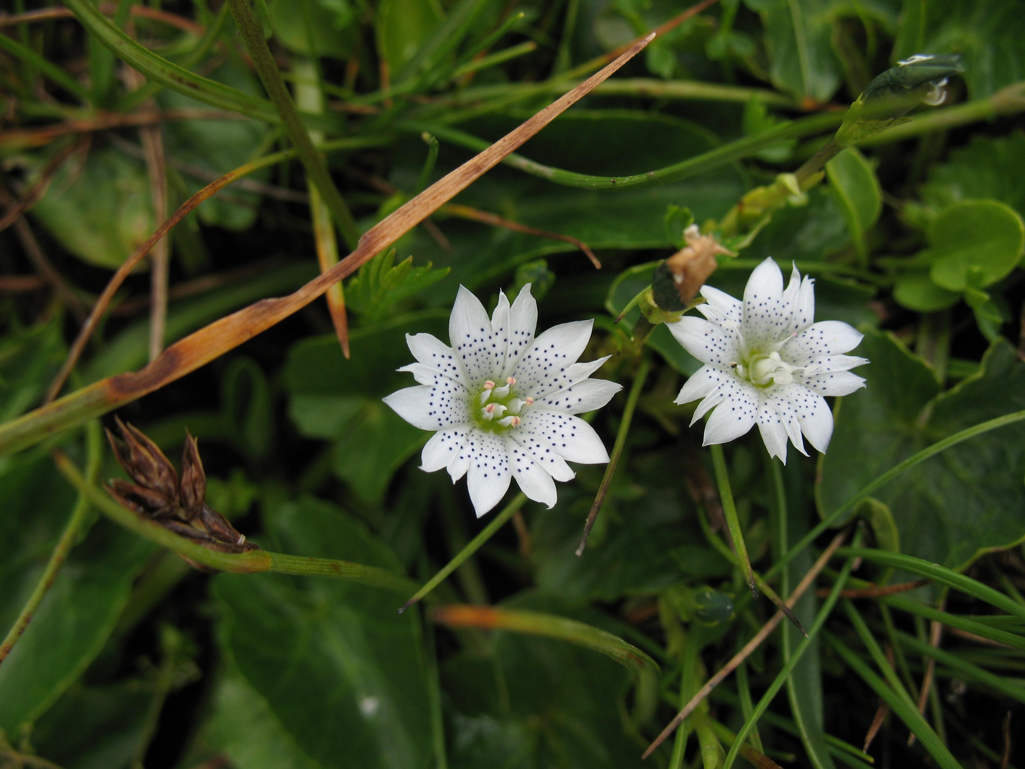On hummocks in meadow by stream. Calyx green; corolla white, inside of corolla with band of black dots.