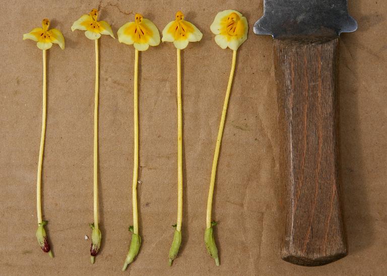 Meadow.Abundant. Corolla pale yellow, lip with white around margin and reddish spots, upper lip with darker spots.