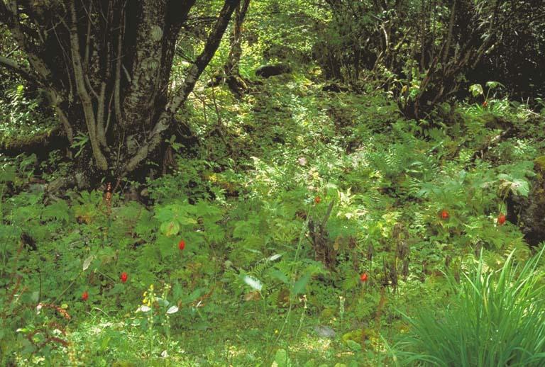 Xizang (Tibet): Gongbo Gyamda Xian. Basong Hu (Basum Tso; Basum Lake). Cut over mixed broadleaved deciduous-mixed conifer forest and interspersed boggy meadows. 30°0'21"N, 93°55'23"E; 3500 m. |