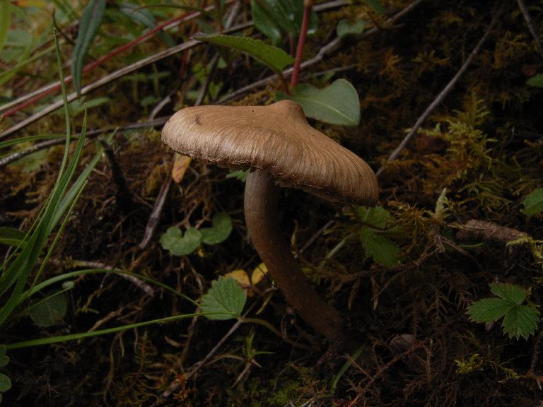 Cap 3 cm in diam., distinctly umbonate, pale and dull ochraceous, innately fibrillose; lamellae sinuate, grayish brown; stipe 6 X 0.5 cm, subcylindrical, base only slightly enlarged, dirty white/.