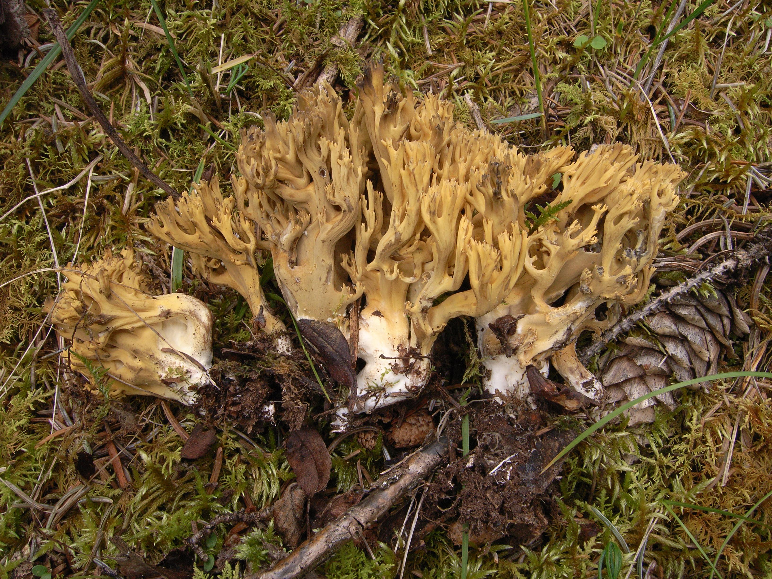 Fruit body up to 8 cm in height and 6 cm in diam., branch dull grayish yellowish brown, often with indistinct olivaceous tinge; stipe indistinct, up to 1.2 cm in diam., white to whitish.