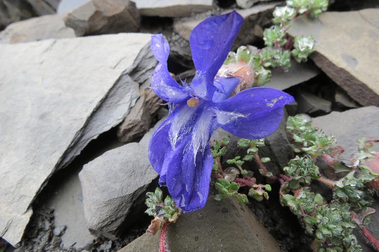 Sepals green; corolla blue, with whitish spots and hairs in throat white.
